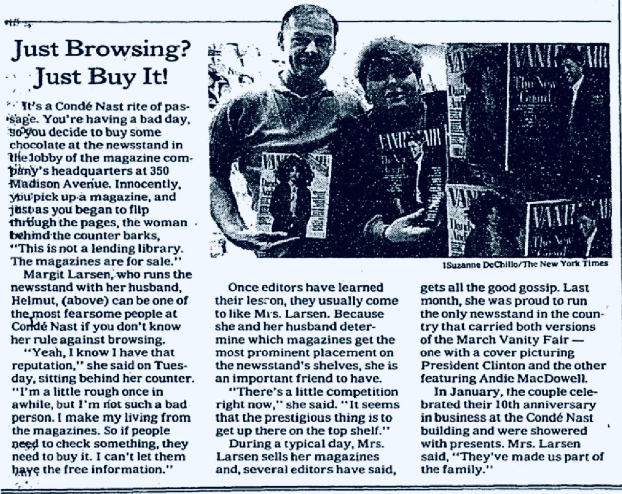 Only years later, do I find it strange that Margit and Helmut, the colorful couple who owned Condé Nast’s lobby newsstand, made a living selling magazines and newspapers, to those who ran a magazine and newspaper empire.