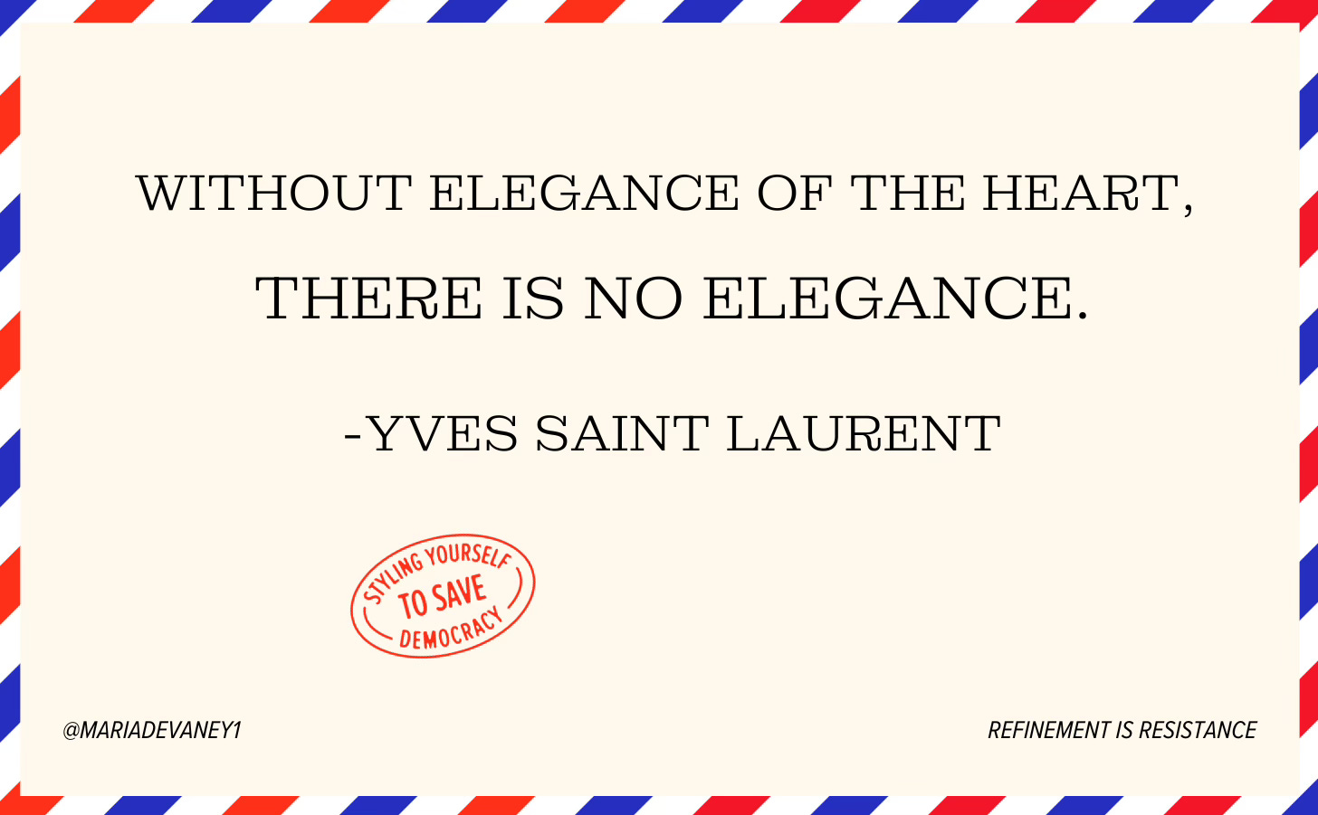 But now let’s climb out of the gutter and up onto a higher plane of thinking and being. Because as Yves Saint Laurent once said, “Without elegance of the heart, there is no elegance.”